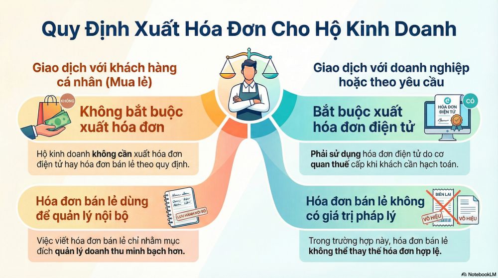 Vì vậy, nếu khách hàng là cá nhân mua lẻ, hóa đơn bán lẻ có thể đủ để xác nhận giao dịch. Nhưng nếu khách là doanh nghiệp yêu cầu chứng từ hợp lệ, hộ kinh doanh bắt buộc phải xuất hóa đơn điện tử theo quy định.